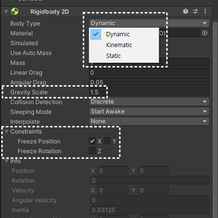 기본 모드로, 중력이나 외부 힘에 자유롭게 반응합니다. 캐릭터나 움직이는 물체처럼 물리적으로 상호작용이 필요한 오브젝트에 사용합니다. |