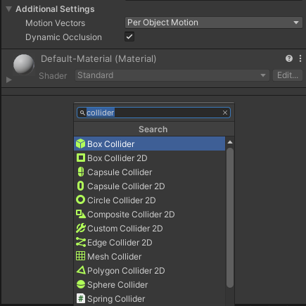 검색창에 Collider를 입력하고, 나타나는 목록에서 Box Collider를 선택해주세요.