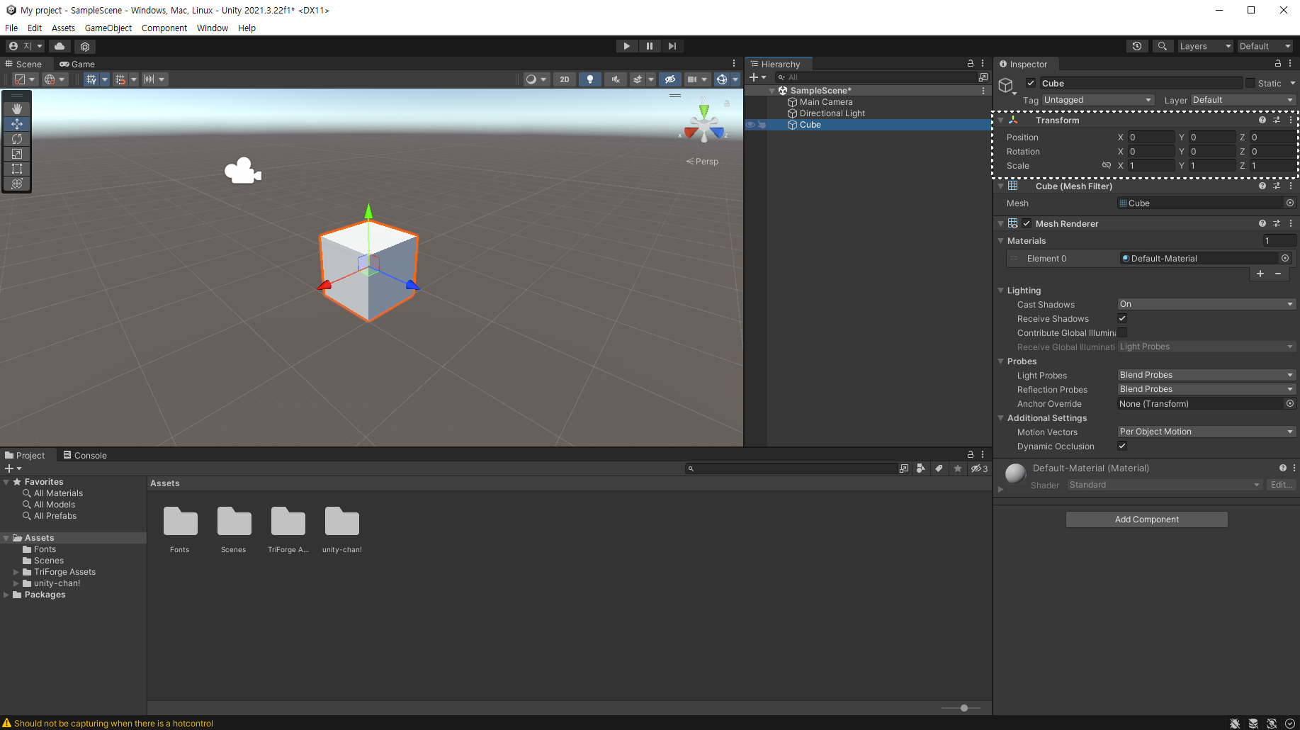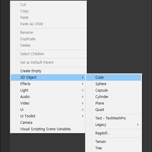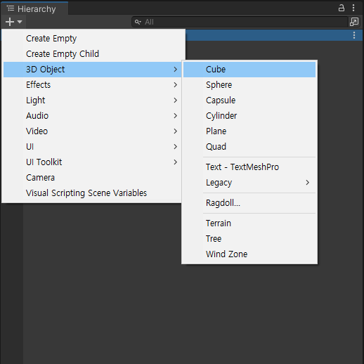 Hierarchy 창에 Cube라는 이름의 오브젝트가 생긴 것을 확인할 수 있습니다.