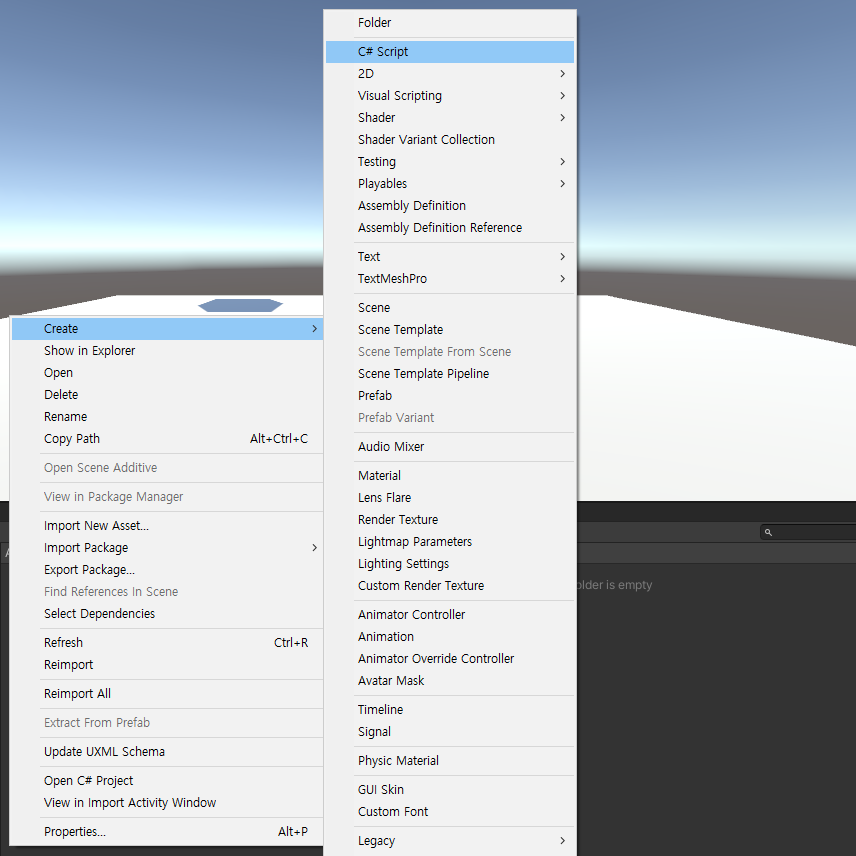 Hierarchy 창의 빈 공간에 마우스 우클릭을 해줄게요.