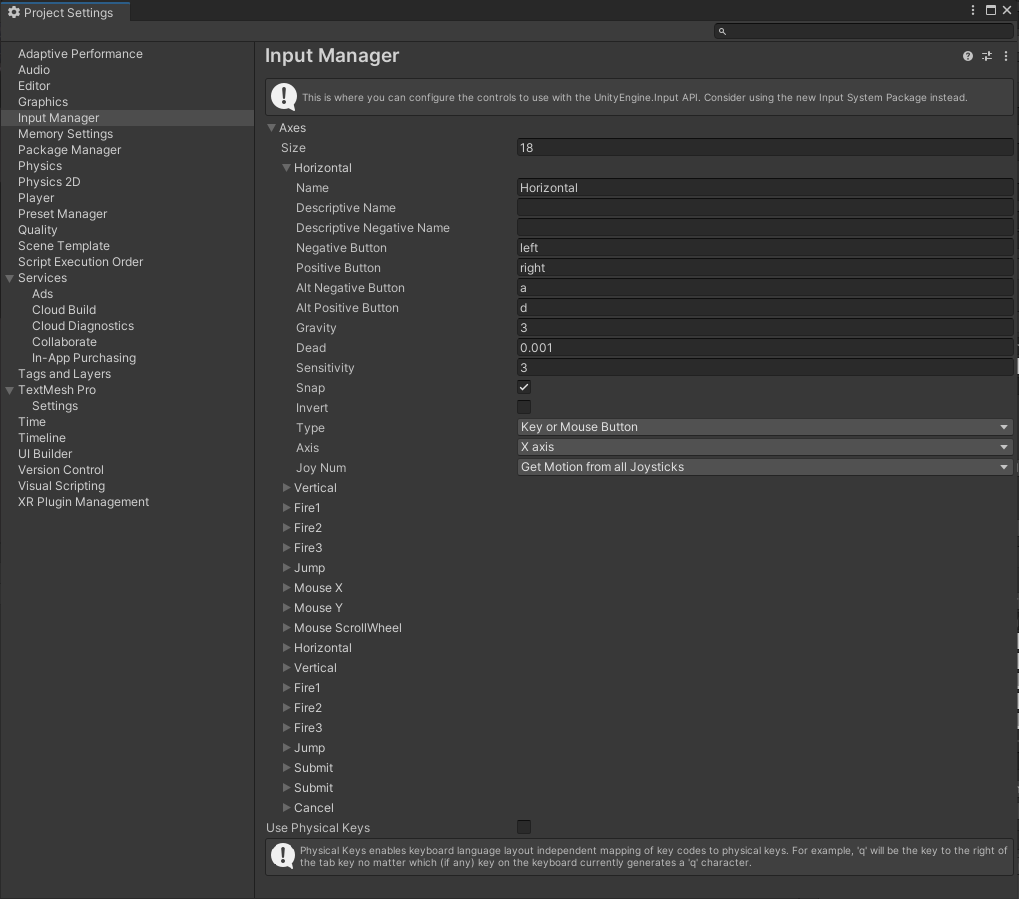 Project Settings > Input Manager에서