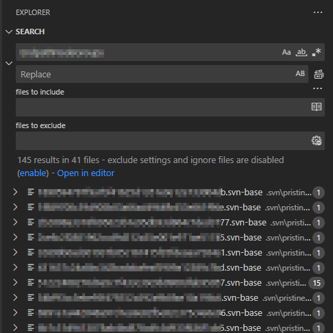 Exclude를 검색하면 검색 제외 파일 형식들이 나옵니다