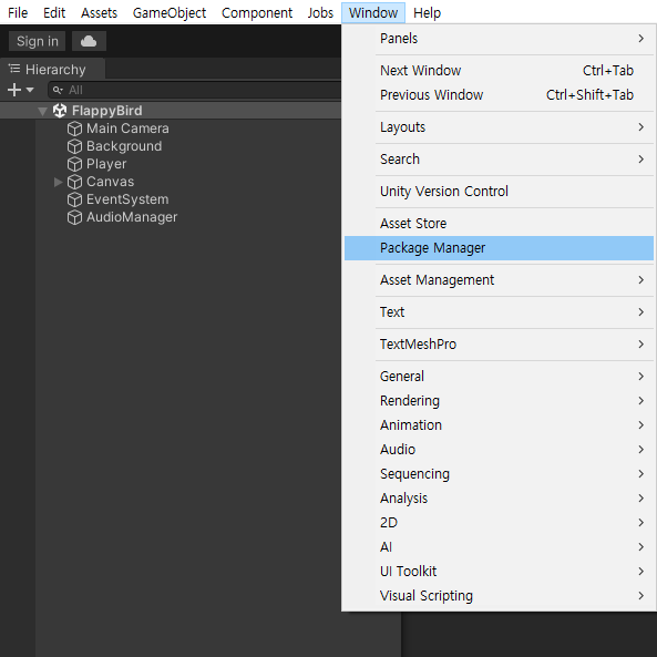 Window > Package Manager로 가서