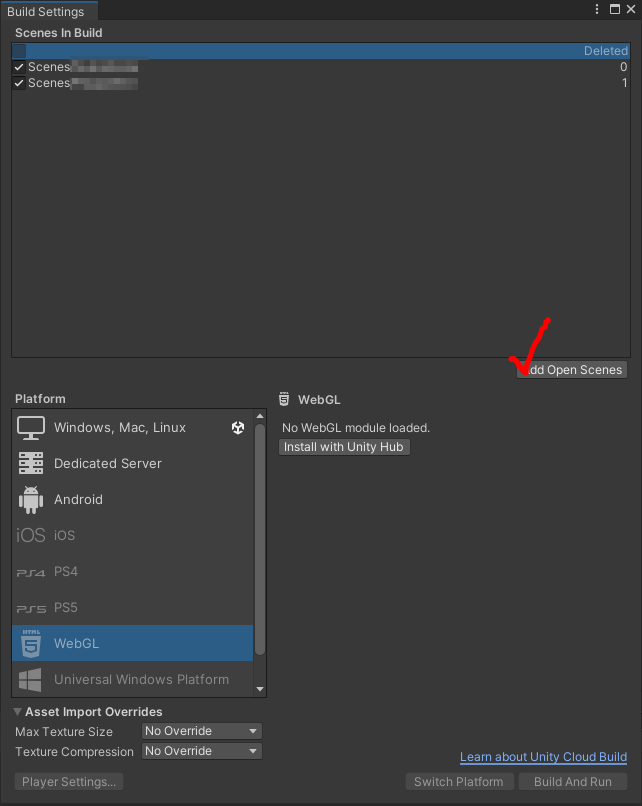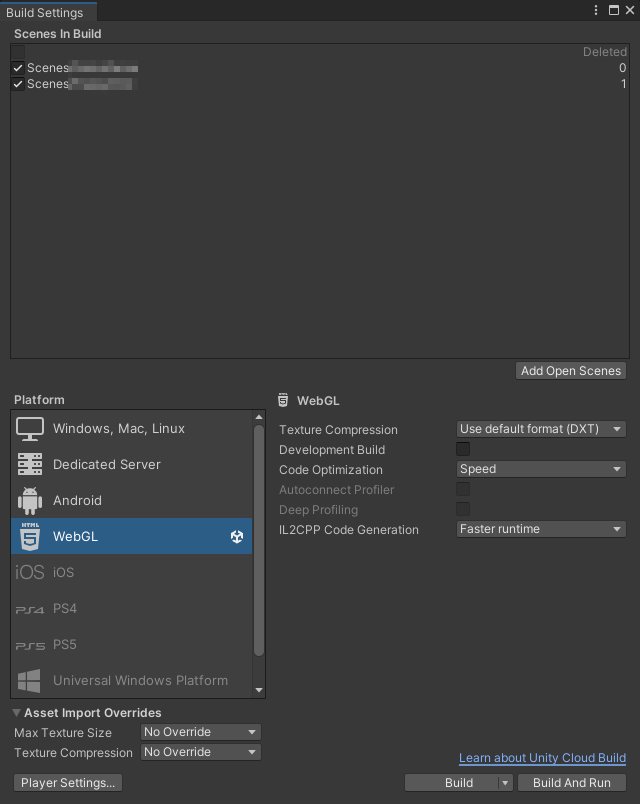 웹 빌드니까 Platform은 WebGL로 설정해주시고